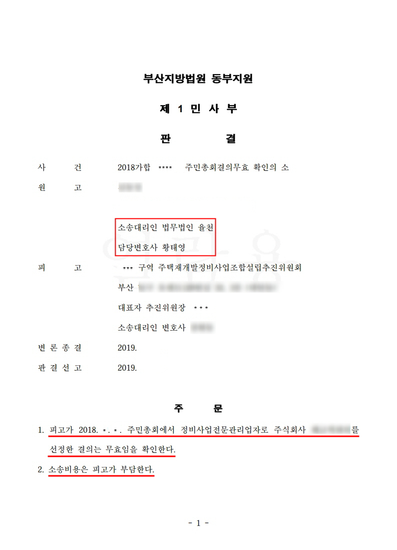 주민총회의 무효확인 판결을 받기 위해 추진위의 업체선정 과정이 불공정했음을 들어 변론을 이었습니다.